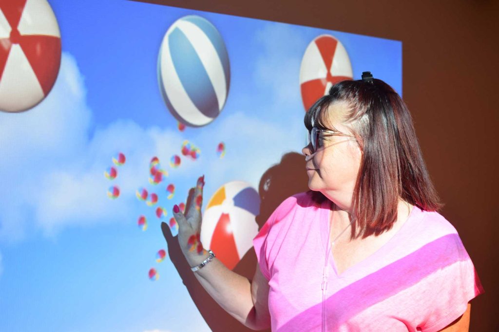 Staff can support patients from the In-Patient Unit to use the room for relaxation or reminiscence. Family members can join in, sharing moments that might once have seemed out of reach. The Social Care team uses the space for games and quizzes with touch functionality, helping people stay engaged and connected. Complementary Therapies staff also use the room to enhance guided meditation and relaxation sessions, creating an environment that supports both physical and emotional wellbeing.